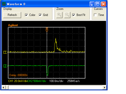 はんだ不良を直すと、信号OK。少しの電圧変化に大きく反応する。計算によるとフォトマルアンプ出力でも5mV程度しかないので、後ろのぎざぎざあたり。