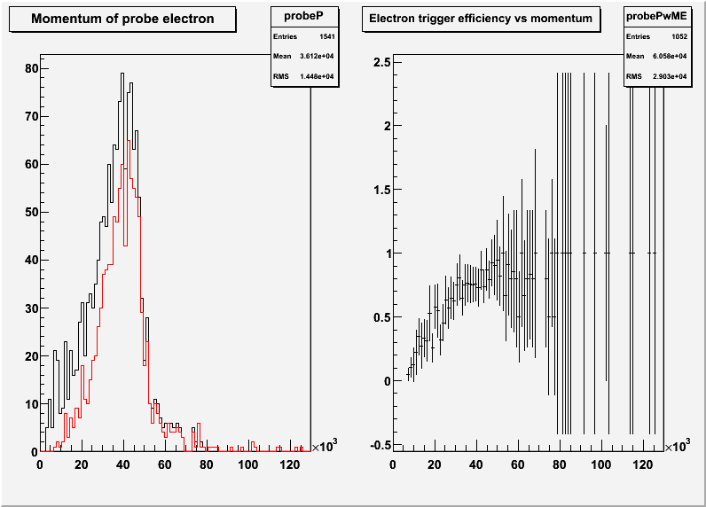 このチュートリアルではちょっと古いZ->eeイベントを使って電子のefficiencyを出している。5GeV以上の電子のトリガーを見ているのは赤の線。黒は全ての電子もしくはトリガーを無視したもの。その比が隣りの図になる。というわけでJ/psiの電子モードは少ない。