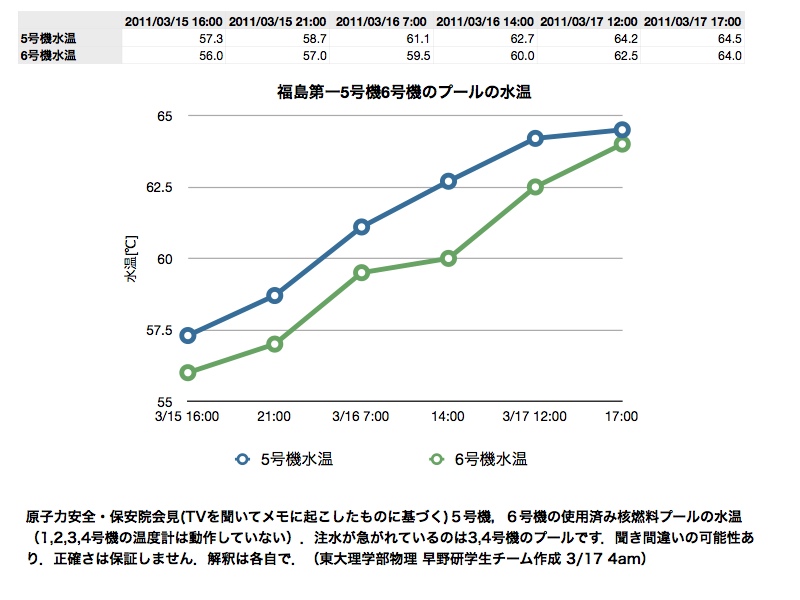 17日10時:これを見ると最悪の危機は脱したように見える。冷温停止の宣言を早く聴きたい。2,3,4,5,6号機は78.4万kW(784MW)で1号機は46万kW。4けた3けた混合で間違えてた。約100万馬力。